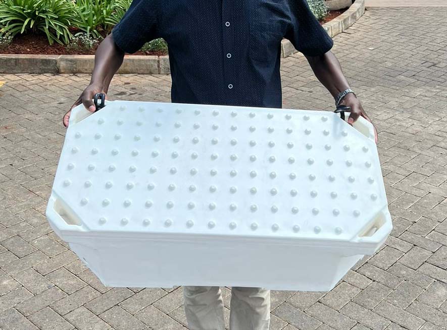 Kaldara Group uses expanded polyethylene (EPE) foam inside its cool boxes. They have developed a method that allows the foam to expand much more than in typical applications, lowering the overall weight and improving the insulating properties of their boxes. Currently the boxes are manufactured in India, but Thor hopes to soon open a factory in Kenya.